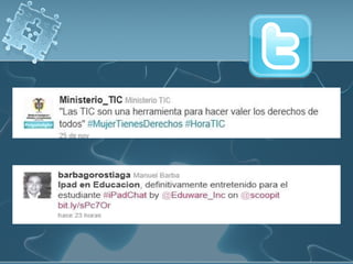 El documento contrasta los sistemas PLE (Personal Learning Environment) y VLE (Virtual Learning Environment). PLE se centra en el aprendizaje personalizado y autogestionado del estudiante a través de redes, mientras que VLE se enfoca en la administración de cursos virtuales por parte de profesores. Además, presenta diversas herramientas tecnológicas útiles para la educación como Prezi, Google Apps, YouTube, SlideShare, blogs, páginas web y Glogster.