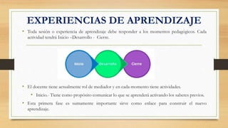 Este documento describe los elementos clave de las experiencias de aprendizaje. Explica que toda sesión de aprendizaje debe seguir tres momentos pedagógicos: inicio, desarrollo y cierre. El inicio activa los conocimientos previos, el desarrollo guía la construcción del aprendizaje a través de materiales y estrategias, y el cierre promueve la metacognición y transferencia. También destaca la importancia de planificar las sesiones de aprendizaje para optimizar el proceso educativo y promover la participación activa.