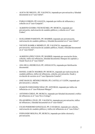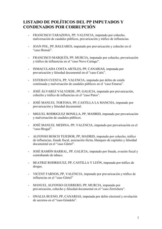 Este documento lista a varios políticos del Partido Popular en España que han sido imputados o condenados por corrupción. Se mencionan más de 50 políticos del PP de diferentes comunidades autónomas que han sido investigados o acusados de delitos como cohecho, malversación, prevaricación, tráfico de influencias y falsedad documental, en muchos casos relacionados con casos de corrupción urbanística conocidos con nombres como Gürtel, Palma Arena u Operación Pokemon.