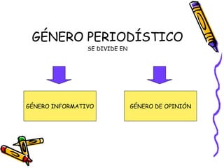 Este documento describe los principales géneros periodísticos de opinión, incluyendo la editorial, la columna y la crítica/reseña. Explica que estos textos presentan valoraciones personales e interpretaciones de los acontecimientos en lugar de solo transmitir hechos. Además, señala que comparten una estructura argumentativa común que incluye una tesis inicial, argumentos de apoyo y una conclusión.