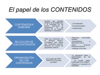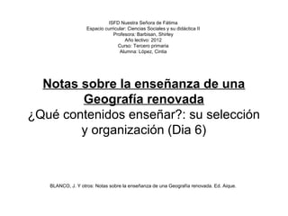 El documento presenta notas sobre la enseñanza de una geografía renovada para el tercer grado de primaria en el año lectivo 2012. Detalla el espacio curricular de ciencias sociales y su didáctica II, la profesora a cargo, el curso y la alumna. Además, incluye información sobre la selección y organización de contenidos geográficos para la enseñanza, tomando como referencia el libro "Notas sobre la enseñanza de una Geografía renovada" por J. Blanco y otros.