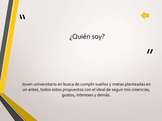 Este documento presenta una breve autobiografía de Juan Camilo Suarez Rojas en 3 secciones: 1) Quién soy - un joven universitario buscando cumplir sus sueños y metas de acuerdo a sus creencias e intereses. 2) Qué hago - estudia y realiza actividades para mejorar su calidad de vida y conocimientos. 3) Para dónde voy - se dirige a cumplir sus metas e involucrarlas en la sociedad para ayudar a los demás utilizando sus conocimientos.