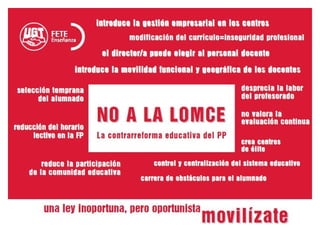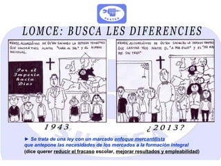 Este documento resume las principales críticas a la Ley Orgánica para la Mejora de la Calidad Educativa (LOMCE) de 2012. Señala que la reforma tiene un enfoque mercantilista que antepone las necesidades de los mercados a la formación integral. También introduce una segregación temprana de los estudiantes y evalúa el rendimiento de los centros en lugar de la inversión. La reforma reduce la participación democrática y aumenta la privatización de la educación.