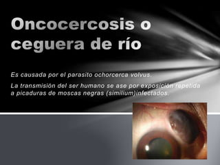 La oncocercosis es causada por el parásito Onchocerca volvulus y se transmite a través de la picadura de moscas negras infectadas. Los síntomas incluyen nódulos subcutáneos, picazón, dermatitis, hinchazón de los ganglios linfáticos, obstrucción linfática y lesiones oculares que pueden causar ceguera. El tratamiento consiste en dosis anuales de ivermectina para matar las microfilarias y prevenir más síntomas.