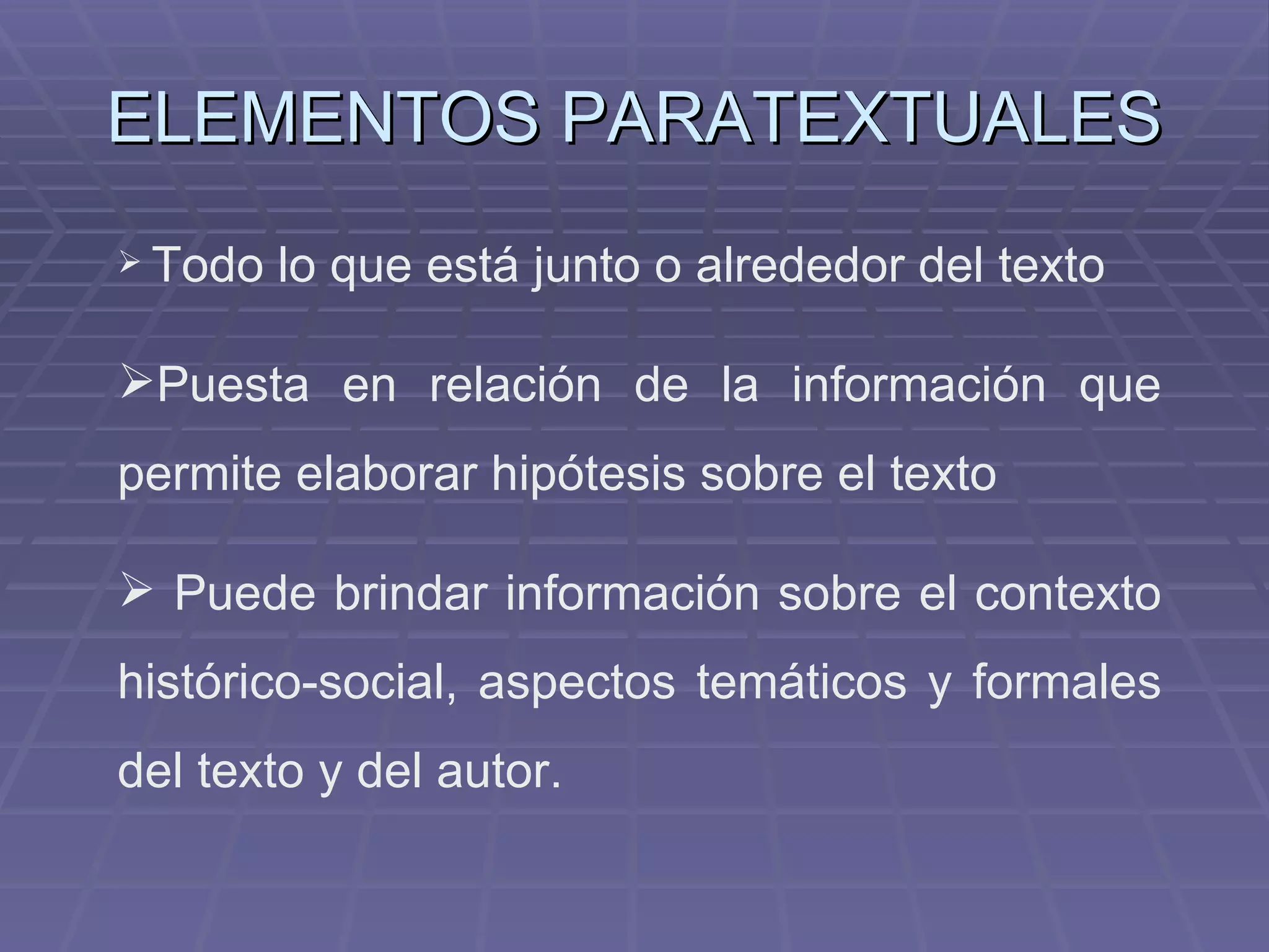 Los elementos paratextuales son todo lo que está junto o alrededor del texto, como la portada, el prólogo o notas al pie, y brindan información sobre el contexto histórico-social del texto y del autor, así como sobre aspectos temáticos y formales, permitiendo elaborar hipótesis sobre el contenido del texto.