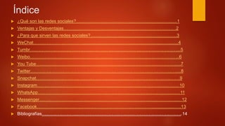 Este documento define qué son las redes sociales y describe las principales redes sociales como WeChat, Tumblr, Weibo, YouTube, Twitter, Snapchat, Instagram, WhatsApp, Messenger y Facebook. Explica brevemente el propósito y características de cada red social.
