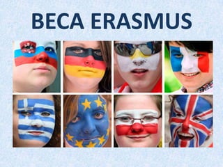 La beca Erasmus permite a estudiantes y profesores universitarios de la UE estudiar en otro país miembro por un trimestre, semestre o curso completo. Ofrece experiencias que crean lazos entre países, enseñan idiomas y culturas, y abren puertas en el mercado laboral europeo. Los requisitos incluyen ser estudiante universitario de un país miembro y haber completado el primer año. Las solicitudes se presentan anualmente en cada universidad.