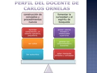 Este documento describe el perfil ideal de un docente y las habilidades que deberían tener. Menciona que los docentes deberían comprometerse a mejorar continuamente sus conocimientos y aplicarlos en clase. También deberían esforzarse por adquirir conocimientos en tecnología a pesar de que puedan ser nuevos y difíciles. Finalmente, se enumeran 20 habilidades informáticas básicas que deberían poseer los docentes aunque actualmente en el país no se cumplan todos estos requisitos debido a barreras como la falta