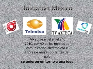 iMx surgió en 2010 cuando 40 de los medios de comunicación más importantes de México se unieron para rescatar y exaltar al México dinámico y emprendedor. iMx reunió a más de 47 mil mexicanos comprometidos con transformar a la sociedad y construir un futuro mejor a través de sus propios esfuerzos.