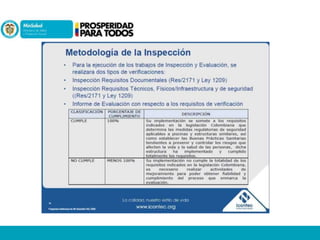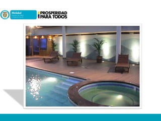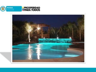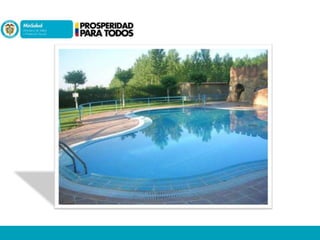 Este documento presenta información sobre los ahogamientos y la normatividad de piscinas en Colombia. Detalla que el ahogamiento es la principal causa de muerte accidental en menores de edad en el país. Explica las competencias de las autoridades municipales y sanitarias en relación con la aprobación, inspección y control de piscinas. Finalmente, resume las obligaciones de los responsables de piscinas respecto al tratamiento y control de la calidad del agua.