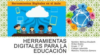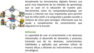 Las herramientas digitales como las computadoras y el acceso a Internet son importantes en la educación actual para permitir que los estudiantes tengan acceso a información en línea. Estas herramientas incluyen redes sociales, software de Office, Photoshop y correo electrónico, y pueden usarse para buscar, organizar y compartir información de varios formatos. Las herramientas digitales también pueden clasificarse en categorías como redes sociales, CMS y software de edición multimedia.