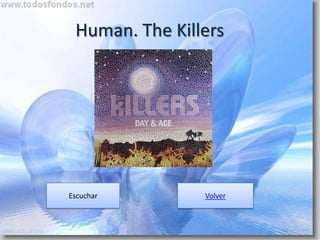 Este documento lista 4 canciones favoritas: "Human" de The Killers, "Viva la vida" de Coldplay, "Estrella polar" de Pereza y "Por ti" de Taxi. Cada canción incluye un enlace para escucharla.