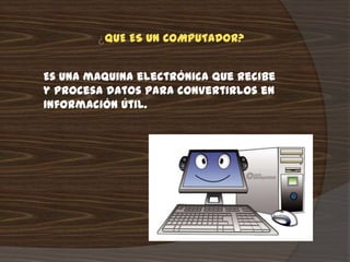 Este documento resume la historia y evolución de los computadores desde las primeras máquinas mecánicas de cálculo en el siglo XVII hasta las generaciones modernas de computadoras personales y supercomputadoras. Explica que los computadores son máquinas electrónicas que procesan datos para producir información útil y describe las cinco generaciones de computadores así como diferentes tipos como supercomputadoras, minicomputadoras y microcomputadoras. También resume los principales dispositivos de almacenamiento como discos duros, memorias flash,