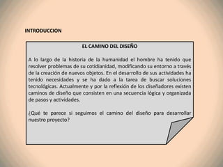 Este documento presenta el proceso de diseño de un juguete electromecánico para niños de bajos recursos. Sigue los 6 pasos del camino del diseño: 1) identificar el problema, 2) buscar información, 3) proponer soluciones, 4) crear planos y planear, 5) construir el juguete, y 6) crear un informe. El robot guía a los estudiantes a través de cada paso y les da instrucciones para completar con éxito el proyecto de diseño.