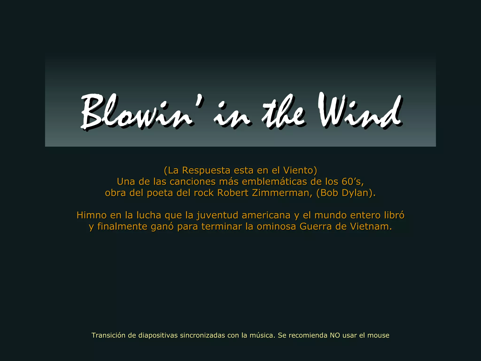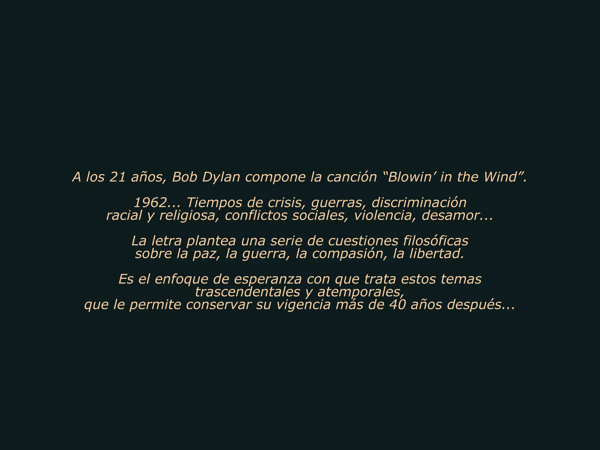 La canción "Blowin' in the Wind" de Bob Dylan, compuesta en 1962, plantea preguntas filosóficas sobre temas como la paz, la guerra y la libertad de una manera esperanzadora. La letra sugiere que las respuestas a estas grandes cuestiones están "flotando en el viento" y no son fáciles de determinar. La canción se convirtió en un himno de la lucha contra la guerra de Vietnam y ha mantenido su vigencia durante más de 40 años.
