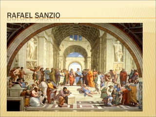 El documento lista varios filósofos, artistas y pensadores importantes de la historia del arte y la filosofía, incluyendo a Leonardo da Vinci, Aristóteles, Heráclito, Parménides, Hipátia de Alejandría, Diógenes, Pitágoras, Plotino, Sócrates, Alejandro Magno, Anaximandro, Averroes, Rafael y Bramante. La lista proporciona una visión general de algunas de las figuras más influyentes en el desarrollo del arte y el pensamiento a través de los años.
