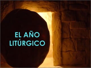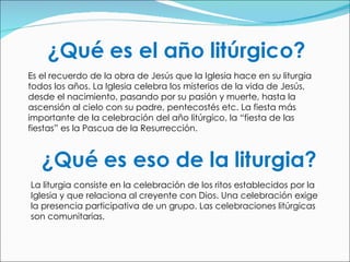 El documento describe los diferentes tiempos y festividades del año litúrgico de la Iglesia católica, incluyendo Adviento, Navidad, Cuaresma, Semana Santa, Pascua y Tiempo Ordinario. Explica los colores litúrgicos asociados a cada período y las vestiduras usadas por los sacerdotes durante las celebraciones.