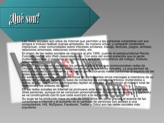 Las redes sociales son sitios web que permiten a las personas conectarse y compartir contenido. Se originaron en 1995 y han crecido en popularidad, con sitios como Facebook y Twitter. Ofrecen servicios como crear perfiles y hacer amigos. Tienen ventajas como mantener contacto con otros y desventajas como riesgos a la privacidad y adicción. Representan tanto oportunidades como amenazas para los usuarios.