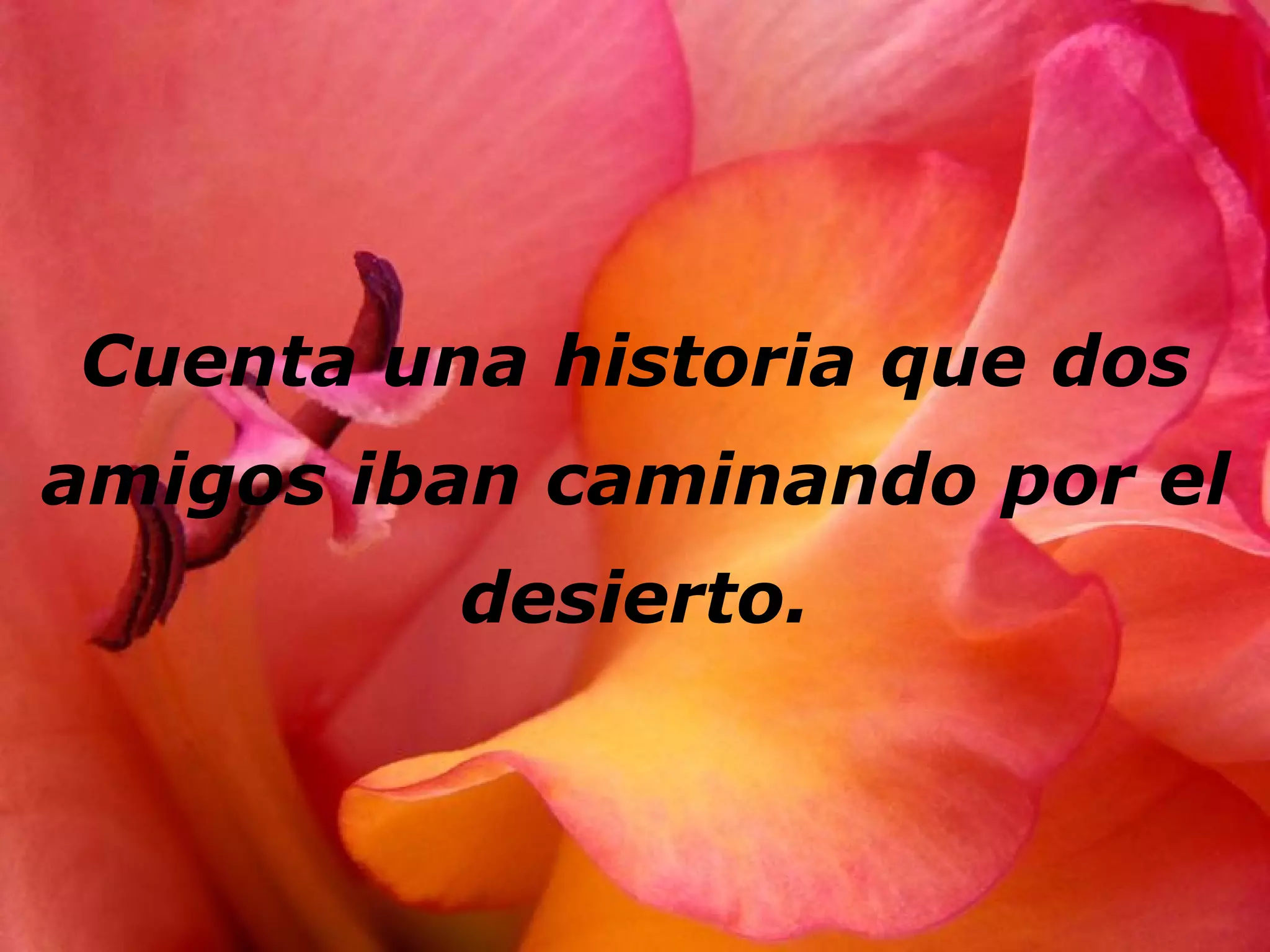 La historia cuenta de dos amigos que discutieron mientras caminaban por el desierto. Uno abofeteó al otro, quien escribió la ofensa en la arena. Más tarde, uno salvó al otro de ahogarse, por lo que escribió la acción buena en una piedra. Explicó que las ofensas deben escribirse en la arena para que se borren, mientras que las buenas acciones deben grabarse en piedra para recordarlas siempre.