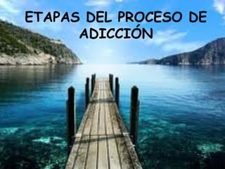 Este documento describe las etapas típicas del proceso de adicción a las drogas: 1) Enamoramiento con el consumo inicial, 2) Luna de miel con el uso continuado, 3) Traición cuando aumentan los problemas, y 4) Ruina con la obsesión y deterioro. Luego siguen etapas de desengaño, hastío y divorcio, donde la persona puede optar por continuar consumiendo, abstenerse temporalmente o cambiar.