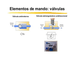 El documento describe los conceptos básicos de la neumática, incluyendo los tipos de compresores neumáticos, circuitos neumáticos, elementos actuadores como cilindros y válvulas, y aplicaciones de la neumática. Explica ventajas como su capacidad para generar grandes fuerzas y movimientos precisos, e inconvenientes como su ruido.