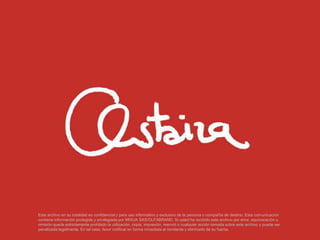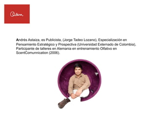 Este documento contiene información confidencial sobre Andrés Astaiza, un experto colombiano en marketing olfativo. Detalla su experiencia laboral de más de 10 años en el campo del marketing y la publicidad, sus conferencias y entrevistas en medios de comunicación. También menciona algunos de sus hallazgos sobre el poder del olfato y los sentidos en las decisiones de compra, así como clientes destacados para quienes ha realizado campañas de marketing multisensorial.