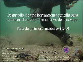 El documento presenta el desarrollo de una herramienta sencilla para que los pescadores de navajas conozcan el estado reproductivo de su recurso, centrándose en la talla de primera madurez y el ciclo reproductivo de la navaja. Se busca reducir el desabastecimiento del mercado a través de una mejor gestión pesquera, integrando aspectos biológicos y hidrodinámicos. Se concluye que la madurez sexual se alcanza a los 79 mm, lo que es inferior a la talla comercial establecida de 100 mm.