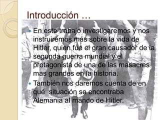 El documento resume la vida y la ideología de Adolf Hitler y el estado de Alemania bajo su liderazgo. Describe los orígenes humildes de Hitler y su servicio militar en la Primera Guerra Mundial. Explica los principios ideológicos del nazismo como la superioridad de la raza aria y el antisemitismo. Detalla cómo Hitler se convirtió en canciller de Alemania en 1933 y luego dictador totalitario, estableciendo un régimen de terror que condujo a la Segunda Guerra Mundial y el Holocausto.