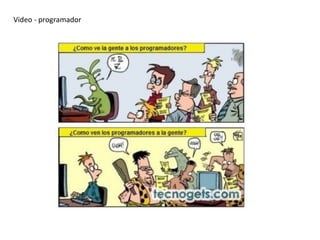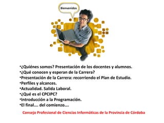 El video presenta una introducción a la carrera de programación y al Consejo Profesional de Ciencias Informáticas de la Provincia de Córdoba. Se discute el plan de estudios, los perfiles y salidas laborales de la carrera. También se introduce la programación y se da la bienvenida a los estudiantes. El segundo documento describe el rol del analista funcional como enlace entre los usuarios y el área de informática de una empresa, brindando apoyo y capacitación para obtener el máximo rendimiento de los programas. Se enumeran algunas de las
