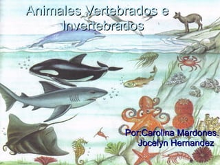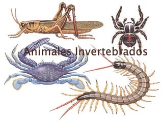 Este documento describe las características distintivas de los principales grupos de animales vertebrados e invertebrados. Los vertebrados se dividen en peces, anfibios, reptiles, aves y mamíferos. Los invertebrados incluyen esponjas, medusas, gusanos, moluscos, artrópodos y equinodermos. Se proporcionan ejemplos de cada grupo y se describen sus características clave como la presencia o ausencia de esqueleto, branquias, plumas, pelo u otras adaptaciones.