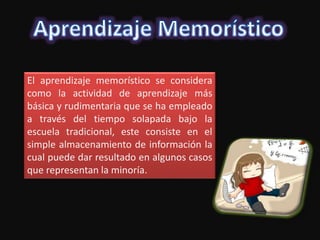 El documento discute los problemas con el aprendizaje memorístico, que involucra la repetición mecánica de información sin comprenderla realmente o relacionarla con conocimientos previos. Este método de aprendizaje se olvida fácilmente y solo beneficia a una minoría. En contraste, el aprendizaje significativo asocia nueva información con conceptos existentes de manera que tiene más sentido y puede retenerse por más tiempo.