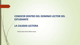 Este documento describe 5 niveles de calidad lectora en estudiantes, desde no lector hasta lector fluido. En el nivel 1, el estudiante no sabe leer nada. En el nivel 2, lee de forma silábica. En el nivel 3, lee palabra por palabra. En el nivel 4, une algunas palabras. En el nivel 5, lee de forma fluida y con entonación. También menciona registrar los resultados de lectura para solicitar apoyo externo a estudiantes con bajo rendimiento.