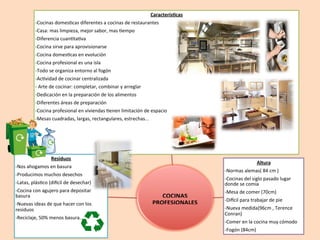 Las cocinas domésticas se diferencian de las cocinas profesionales en que permiten una mejor limpieza y sabor de los alimentos, así como más tiempo para la preparación. Mientras que las cocinas profesionales se organizan en torno al fogón y la actividad de cocinar es centralizada, las cocinas domésticas evolucionan hacia áreas separadas para la preparación. Un reto de las cocinas domésticas es la gran cantidad de residuos que se producen, incluyendo latas y plástico de difícil desecho, por lo que se necesitan nuevas ideas para su