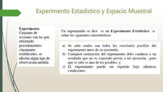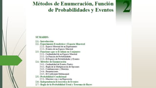 Este documento trata sobre conceptos básicos de probabilidad y estadística como espacio muestral, eventos, funciones de probabilidad, propiedades de funciones de probabilidad, ejemplos ilustrativos, métodos de enumeración, reglas de multiplicación de opciones, combinaciones, muestras y permutaciones. Explica estos temas fundamentales para comprender experimentos estadísticos y calcular probabilidades.