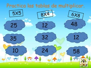 El documento presenta diferentes actividades matemáticas como sumar, restar, multiplicar y dividir para que los niños practiquen. Incluye ejemplos numéricos de cada operación junto con sus respuestas. También presenta instrucciones para la maestra sobre las tablas de multiplicar.