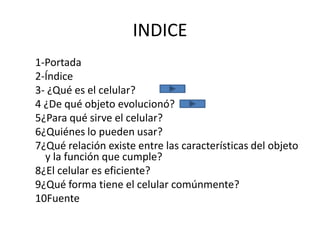 Este documento presenta un índice de 9 puntos sobre el celular. Explora qué es el celular, de qué objeto evolucionó, para qué sirve, quiénes lo pueden usar y la relación entre sus características y funciones. También considera si el celular es eficiente y qué forma tiene comúnmente, concluyendo con la fuente de la información.
