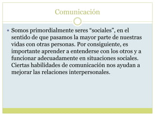 La comunicación es un proceso fundamental para las relaciones humanas, ya que los seres humanos somos seres sociales que pasamos la mayor parte del tiempo con otras personas. La comunicación implica un emisor que envía un mensaje a través de un canal o medio a un receptor, usando un código o lenguaje. Para que la comunicación sea eficaz, el receptor debe interpretar el mensaje tal como lo pretendía el emisor.