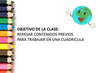 Este documento repasa los puntos cardinales y las cuadrículas. Explica que los puntos cardinales (Norte, Sur, Este y Oeste) nos ayudan a orientarnos y que se ubican en la rosa de los vientos. Luego define una cuadrícula como un sistema de coordenadas compuesto de filas horizontales, columnas verticales y cuadrantes formados por su intersección. Finalmente, recomienda un video para aclarar dudas sobre la localización en cuadrículas.