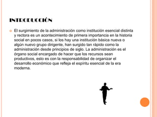 Este documento define la administración y describe sus características y funciones. La administración se define como el proceso de diseñar y mantener un ambiente en el que las personas trabajando en grupo alcancen con eficiencia metas seleccionadas. Algunas características clave son su universalidad, valor instrumental, unidad temporal y amplitud de ejercicio. Las funciones del administrador incluyen la producción, mercadotecnia, finanzas y recursos humanos. Los objetivos de la administración son alcanzar las metas de forma eficiente y efic