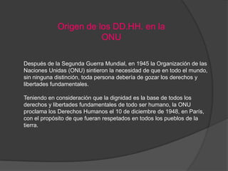 Después de la Segunda Guerra Mundial, la ONU creó la Declaración de los Derechos Humanos para garantizar la dignidad y libertad de todas las personas. La declaración, aprobada en 1948, establece derechos como la no discriminación y los derechos de los pueblos indígenas. Su creación ayudó a prevenir futuros atropellos a la paz y la libertad.