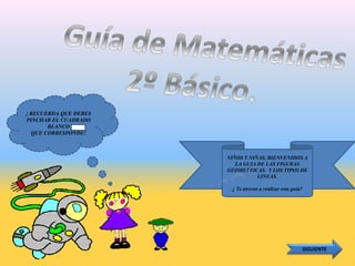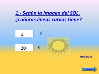 Este documento presenta una guía interactiva sobre figuras geométricas y tipos de líneas para niños. Consta de 10 preguntas con varias opciones de respuesta sobre conceptos básicos de geometría como círculos, cuadrados, triángulos, líneas rectas y curvas. Después de cada pregunta, se explica la respuesta correcta.