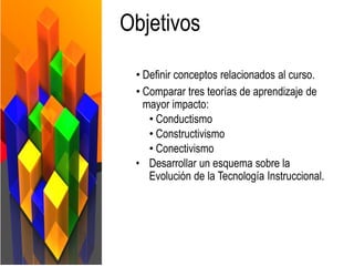 El documento proporciona definiciones y comparaciones entre varias teorías de aprendizaje: conductismo, constructivismo y conectivismo, así como un esquema de la evolución de la tecnología educativa. Además, se discuten conceptos clave como epistemología, evaluación y estándares tecnológicos tanto para alumnos como para docentes. Se concluye que estas teorías y la evolución de la tecnología tienen un impacto significativo en la educación a distancia y en el aprendizaje contemporáneo.