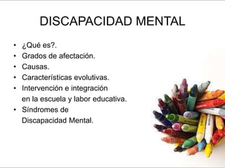 Este documento trata sobre la discapacidad mental y el síndrome de Down. Describe las características del síndrome de Down como dificultades en el aprendizaje, lenguaje y habilidades cognitivas, así como rasgos físicos característicos. También habla sobre la historia de una familia que adoptó a dos niños con síndrome de Down y los desafíos que enfrentan en la escuela y la sociedad debido a la falta de comprensión sobre la discapacidad.