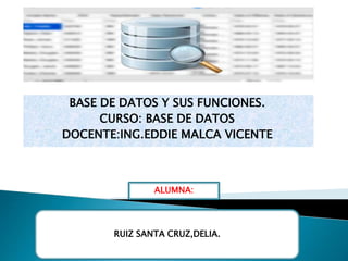El documento describe las funciones del administrador de base de datos (DBA) y el administrador de datos. Explica que el DBA se encarga de la creación y mantenimiento técnico de la base de datos siguiendo las políticas establecidas por el administrador de datos. Además, las principales responsabilidades del DBA incluyen administrar la estructura y los datos de la base de datos, así como garantizar la confiabilidad y seguridad de la misma.