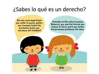 Este documento describe los derechos de los niños según la Convención sobre los Derechos del Niño. Todos los niños tienen derecho a ser protegidos, a recibir ayuda cuando lo necesiten, y a expresar sus opiniones. Algunos de los derechos específicos mencionados son el derecho a un nombre, a recibir atención médica, a jugar y aprender, y a practicar su propia cultura.