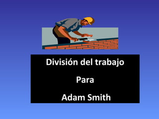 Adam Smith explica que la división del trabajo conduce a una mayor especialización y productividad a nivel global y local. Identifica dos ámbitos de división del trabajo: 1) entre trabajos diversos orientados a fines diversos, y 2) dentro de cada proceso de producción en fases especializadas. Esto permite ahorrar tiempo a través de la especialización, reducir errores al simplificar funciones, e innovar maquinaria.