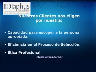 ![Nuestros Clientes nos eligen por nuestra: Capacidad para escoger a la persona apropiada. Eficiencia en el Proceso de Selección. Ética Profesional [email_address]](https://image.slidesharecdn.com/pptrecursoshumanos-12803999626382-phpapp01/85/Ppt-Division-Recursos-Humanos-2-320.jpg)