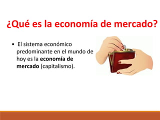 La economía de mercado se basa en el libre juego de la oferta y la demanda para establecer precios justos. En el mercado, los vendedores ofrecen mercancías y los compradores las demandan. El precio depende de la cantidad de oferta y demanda; si la oferta es escasa y la demanda alta, el precio sube, y si la oferta es alta y la demanda baja, el precio baja. La ley de oferta y demanda establece el equilibrio fluctuante entre precio y cantidad vendida según las circunst