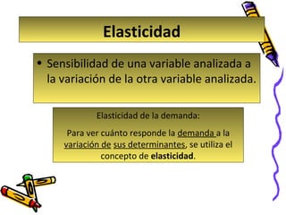 La elasticidad mide la sensibilidad de una variable a los cambios en otra variable. Existen diferentes tipos de elasticidad como la elasticidad-precio de la demanda, elasticidad-ingreso de la demanda, y elasticidad-precio de la oferta. La elasticidad-precio de la demanda indica si un cambio en el precio resulta en un cambio más, igual o menos que proporcional en la cantidad demandada.