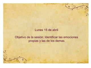 Este documento trata sobre la identificación y comprensión de las emociones propias y de los demás. Explica que las emociones son parte integral de la vida humana y cumplen funciones importantes como darnos energía y alertarnos de peligros. También ofrece consejos sobre cómo manejar emociones como el miedo, la tristeza, la ira y la alegría de manera saludable.